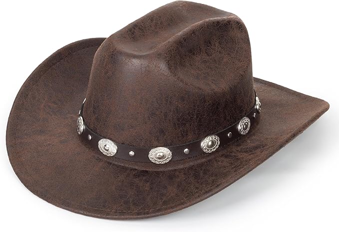 Women-Men Brown PU-Leather Western Distressed-Cowboy-Hat - Wide-Brim Cowgirl Rodeo Outback Hats with Buckle (22")