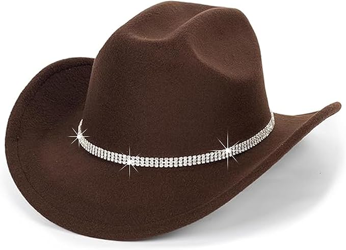Classic-Western Felt-Cowboy-Hat for Men-Women Solid-Color Roll-Up-Brim Cowgirl-Hat with Rivets Rhinestones Decor Medium
