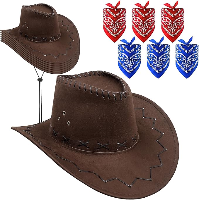 12 Pack Cowboy Hat Bulk, Brown Wide Brim Western Cowboy Hat, Faux Suede Cowboy Hats Party Hats with Bandana and Adjustable
