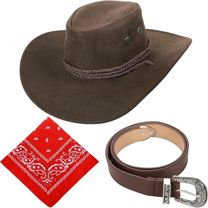 Men Cowboy Costume Hat with Bandana Belts Cowboy Cowgirl Hat Wide Cowboy Brim Hat Cowboy Costume Accessories