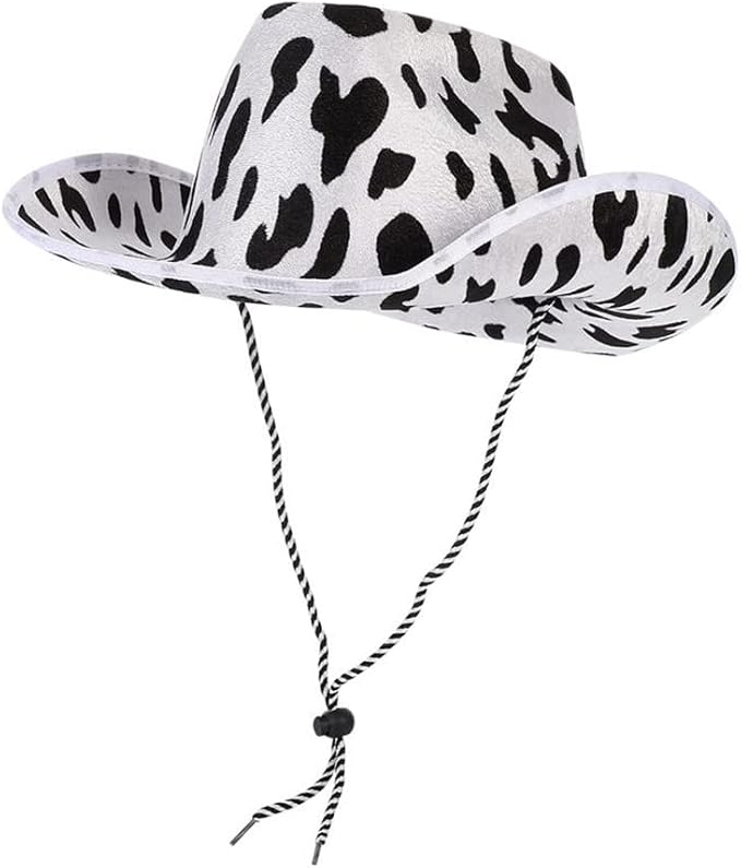 Cow Print Cowboy Hat White and Black Felt Hat with Adjustable Lanyard Cowboy Style Hat for Men and Women