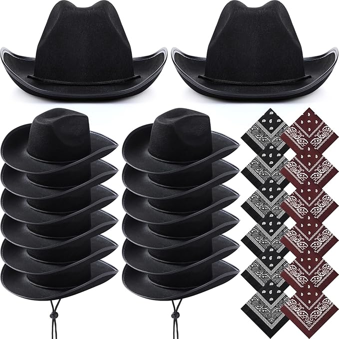 24 Pcs Adult Cowboy Hat with Paisley Bandana Western Cowgirl Hat with Wind Lanyard Paisley Pattern Bandanas (Black, Brown)