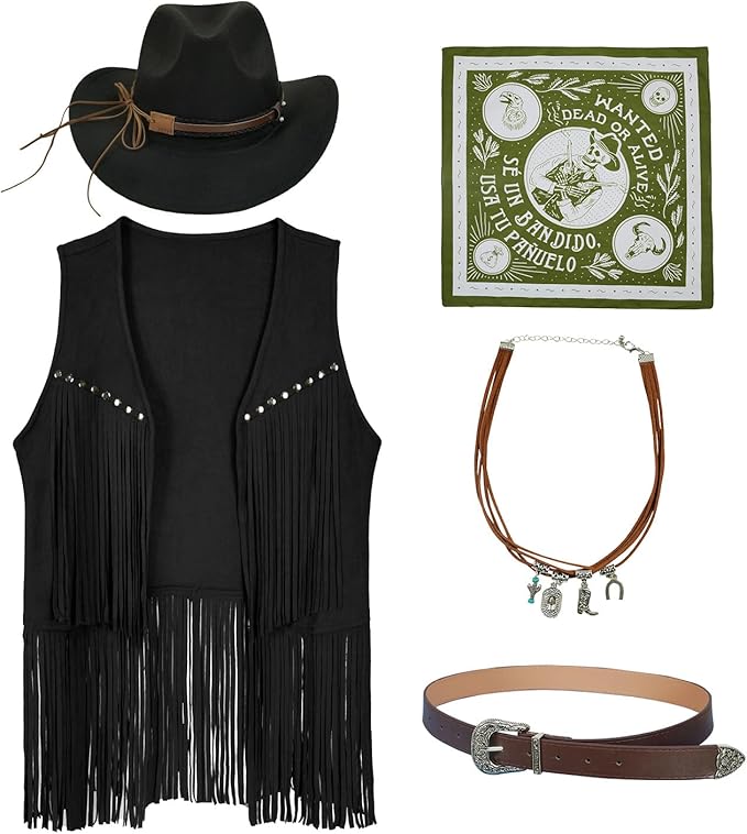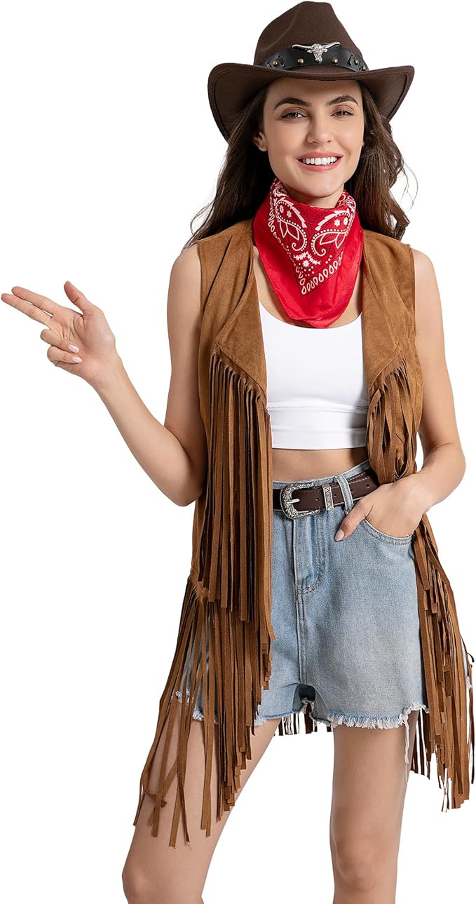 70s Hippie Western Cowgirl Outfit for Women - Tassel Fringe Vest, Cowboy Hat, Cowgirl belt and Bandana