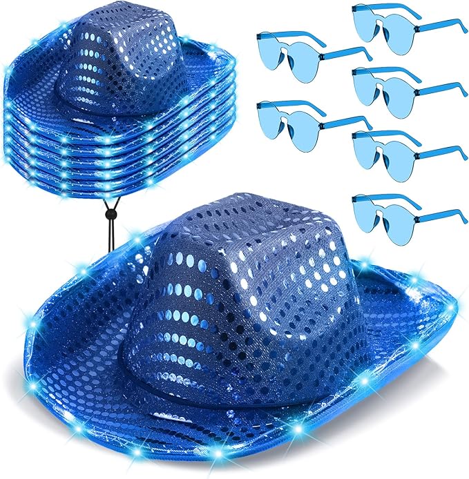 6 Set LED Cowboy Hat Light Up Glitter Cowboy Hat with Sunglasses Sequin Space Cowgirl Hat for Women Men Costume