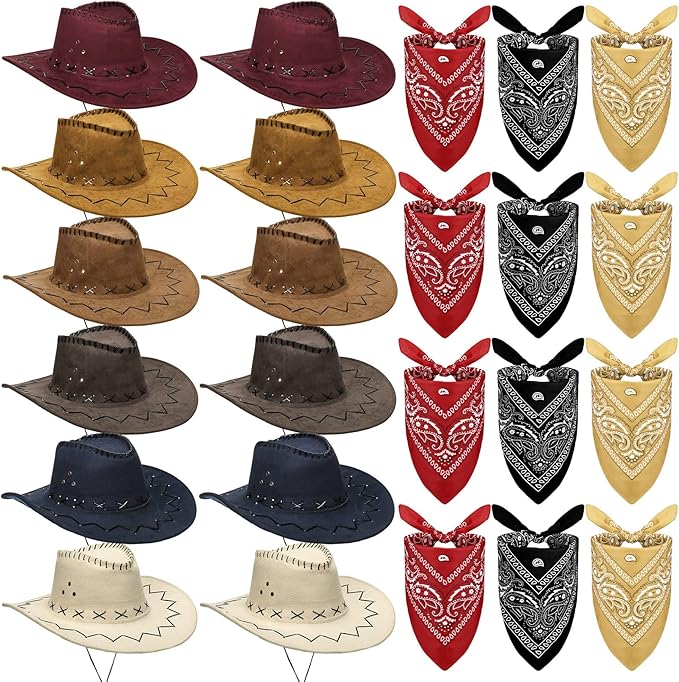 24 Pcs Western Cowboy Hats with Polyester Bandanas Western Cap Suede Leather Hat and Square Bandanas Scarf for Adult