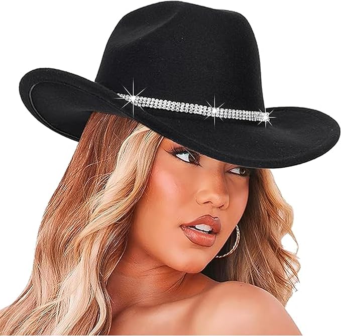 Women Sparkly-Rhinestone Western-Cowgirl-Hat Glitter-Bling Cowboy-Hat Felt-Rodeo-Hat for Disco-Party Medium/Large