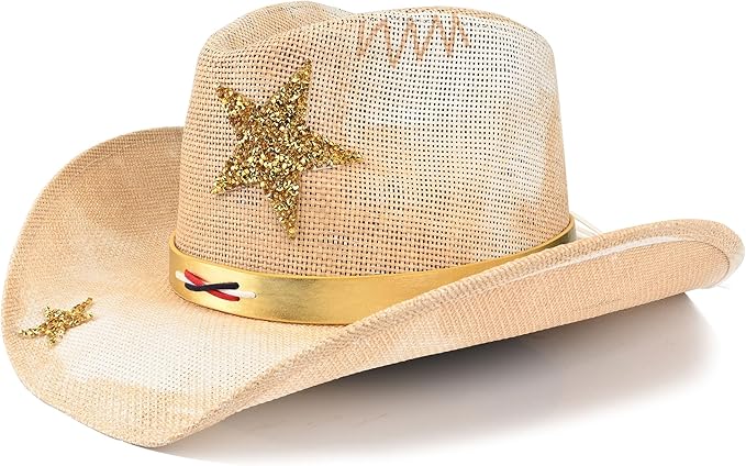 Cowboy Hat with Men's Women's Western Cowgirl Straw Hats,American Style Gold Glitter Star Braided Headband
