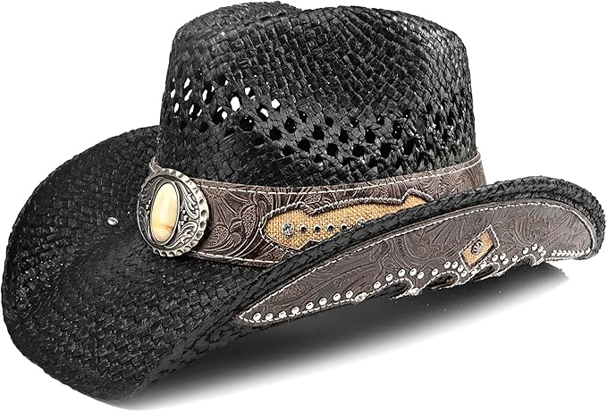 Men's Western Cowboy Hat Classic Style Straw Sun hat,Women's Cowgirl Hat Unique Faux Leather Rivet Decoration